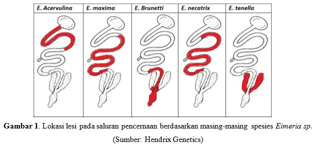 Koksidiosis pada unggas disebabkan oleh parasit protozoa Eimeria sp. Beberapa spesies yang penting dalam peternakan unggas khususnya broiler dan layer diantaranya adalah E. acervulina, E. maxima, E. brunetti, E. tenella, dan E. necatrix. Setiap jenis Eimeria sp. memiliki lokasi yang spesifik pada saluran pencernaan unggas (Gambar 1). Eimeria acervulina menginfeksi duodenum hingga awal jejunum, Eimeria maxima menginfeksi di pertengahan jejunum, Eimeria necatrix menginfeksi di jejunum hingga ileum, Eimeria tenella menginfeksi di sekum, dan Eimeria brunetti di akhir jejunum hingga kolon.