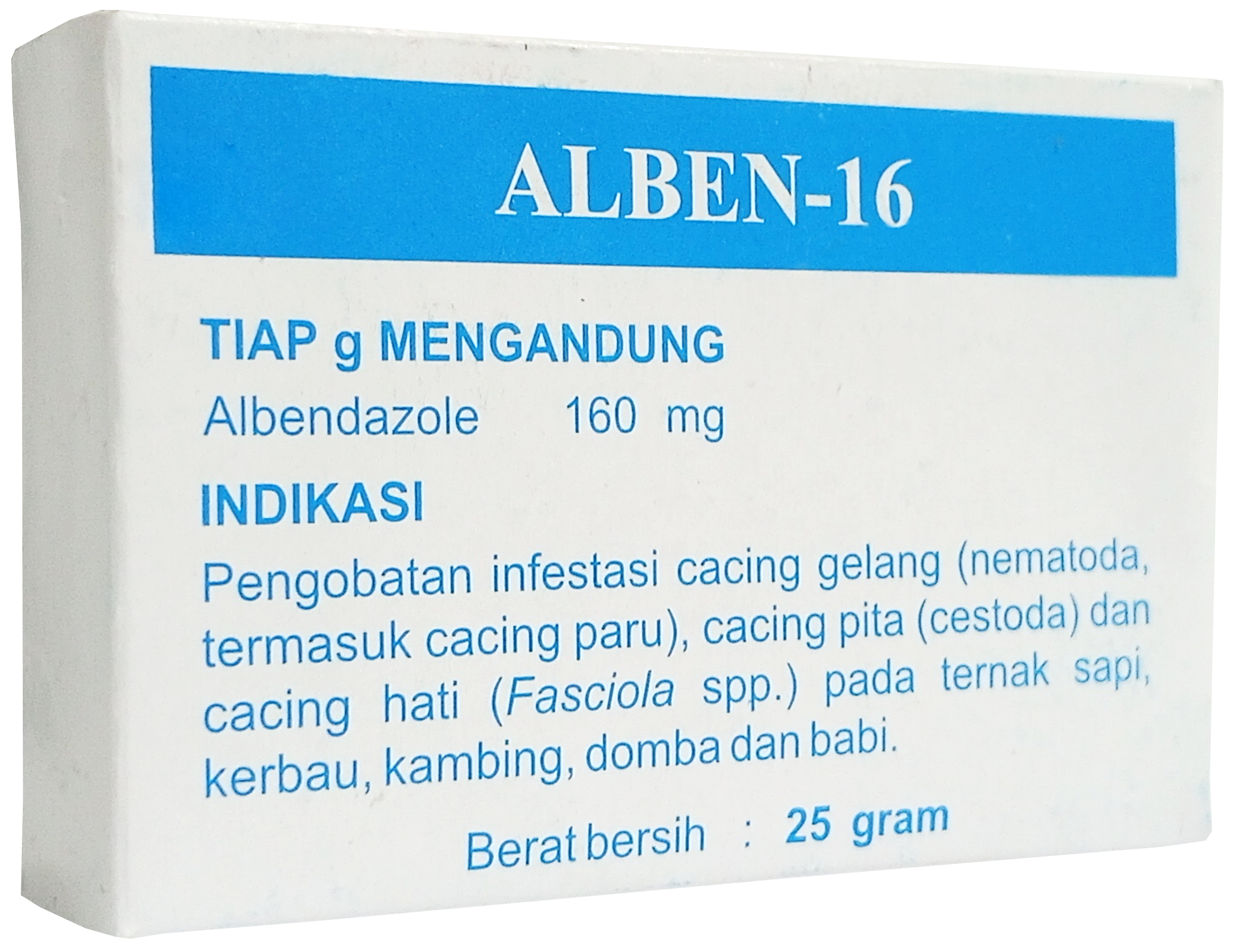 | ALBEN-16® diindikasikan untuk pengobatan infestasi cacing gelang (nematoda, termasuk cacing paru), cacing pita (cestoda) dan cacing hati (Fasciolaspp.,/Distomatosis, dalam kelompok cacing trematoda) pada ternak sapi, kerbau, kambing, domba, babi dan unggas. |