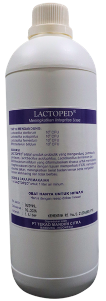 | LACTOPED® adalah produk probiotik yang mengandung Lactobacillus plantarum, Lactobacillus acidophilus, Lactobacillus fermentum dan Bifidobacterium bifidum yang diformulasikan khusus untuk meningkatkan integritas saluran cerna dengan tujuan memperbaiki konversipakan, meningkatkan penyerapan nutrisi pakan, meningkatkan berat badan ternak serta menjadikan kotoran lebih kering dan tidak berbau. |