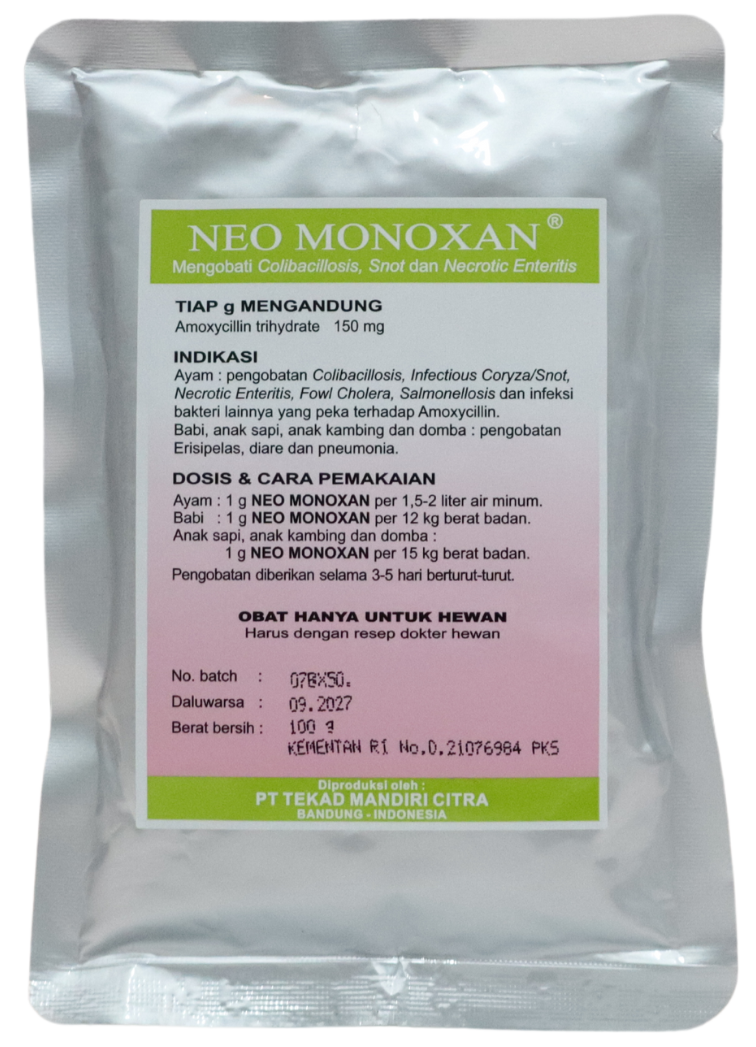 | Amoxycillin merupakan Penisilin semi sintetik berspektrum luas dengan sifat bakterisidal terhadap bakteri gram positif dan gram negatif, seperti: Clostridium, Campylobacter, Corynebacterium, Erysipelothrix, Salmonella,E. coli, Haemophilus, Pasteurella, Staphylococcus dan Streptococcus spp. NEO-MONOXAN® diformulasikan guna mengobati infeksi-infeksi saluran pernafasan, pencernaan, reproduksi dan perkemihan. |