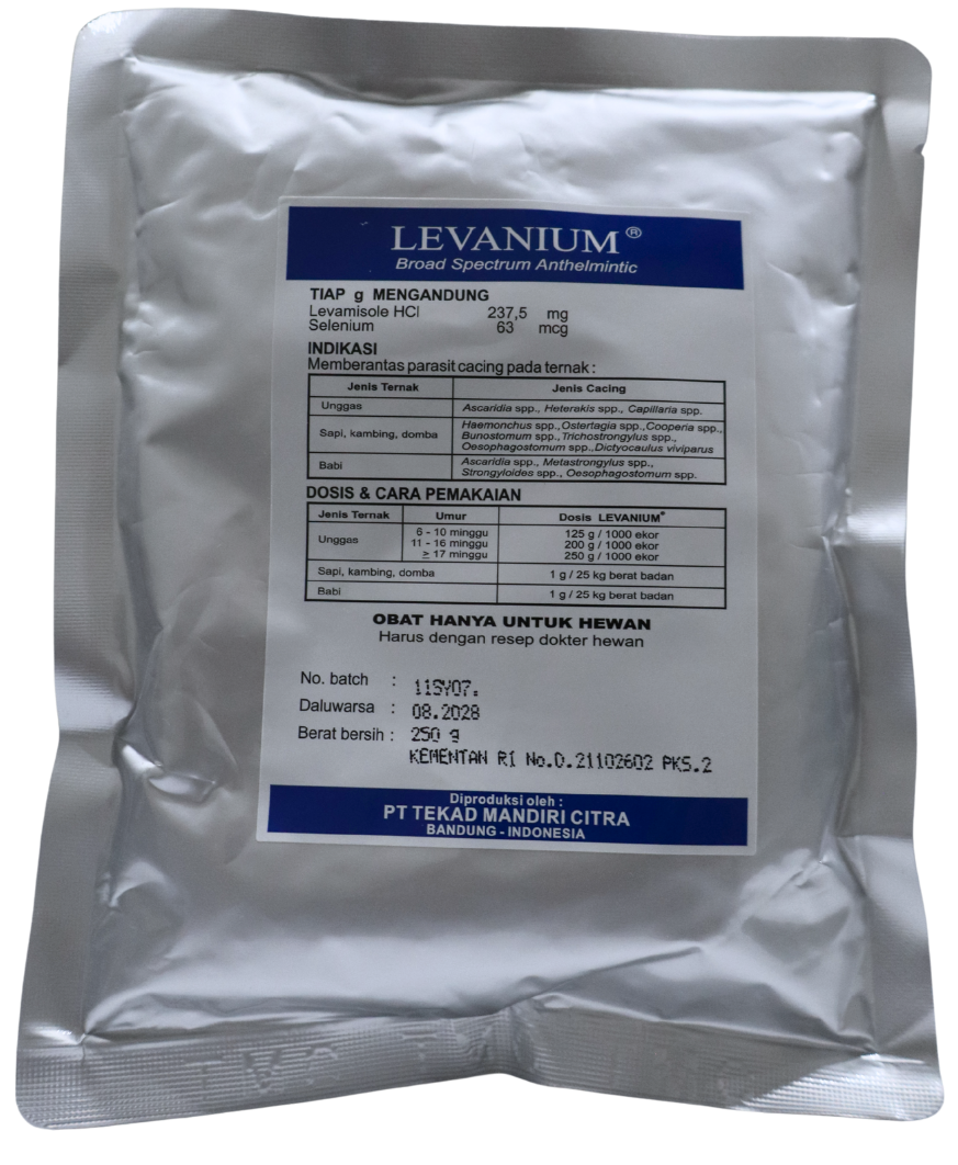 | LEVANIUM® adalah obat cacing dengan kandungan Levamisole HCl yang dikombinasi dengan Selenium. Levamisole HCl sangat efektif untuk memberantas cacing pada saluran pencernaan, sedangkan Selenium selain berperan sebagai antioksidan pada sel tubuh, juga sangat dibutuhkan pada fungsi normal kelenjar pankreas dalam menghasilkan enzim-enzim pencernaan. |