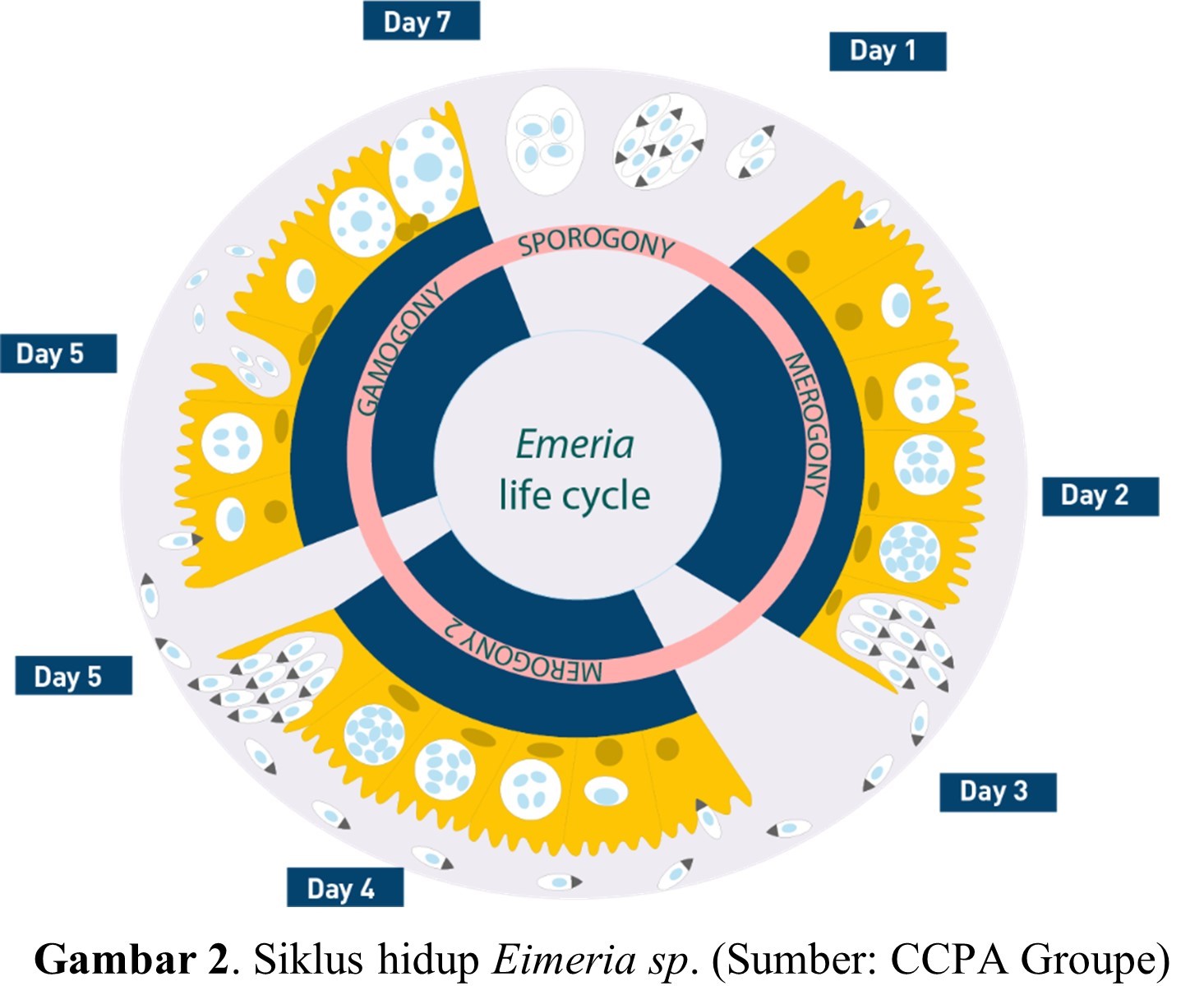 Penyakit koksidiosis menjadi penyakit yang sulit diberantas tuntas karena memiliki siklus hidup yang kompleks di lingkungan ataupun di dalam induk semang. Ookista Eimeria sp. dapat bertahan hidup lama di lingkungan serta relatif tidak mati dengan desinfektan jenis apapun. Siklus hidup Eimeria sp. dalam pencernaan unggas berlangsung 6 – 7 hari dan memiliki siklus seksual dan aseksual (Gambar 2). Ayam yang terinfeksi akan mengeluarkan kotoran yang mengandung ookista yang belum tersporulasi. Ookista ini akan berubah menjadi infektif di lingkungan. Satu ookista mampu memproduksi 200.000-2.000.000 oosit dalam sekali sporulasi. Penularan penyakit koksidiosis melalui anak kandang, peralatan kandang, pakan, air minum atau litter yang tercemar oleh ookista tersporulasi yang kemudian akan tertelan kembali oleh unggas.
