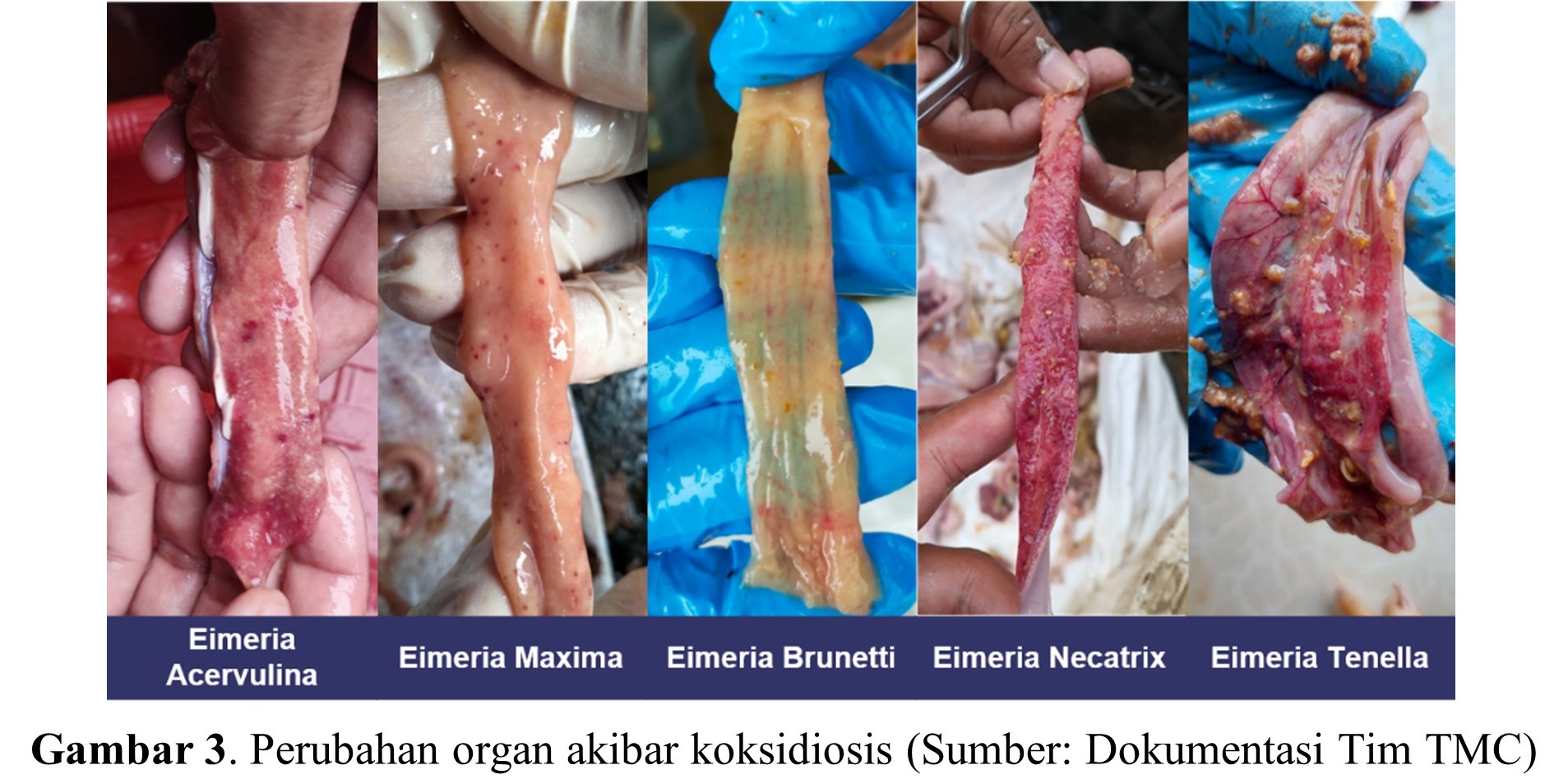 Secara alamiah, ayam memiliki kemampuan untuk membatasi penyebaran Eimeria sp. yang biasa disebut dengan “Self-limiting Disease” dan tergantung pada jumlah ookista yang ditelan dan kekebalan ayam tersebut. Ketika jumlah ookista yang tertelan terlalu banyak maka akan menimbulkan munculnya gejala klinis pada unggas. Ayam yang mengalami koksidiosis biasa ditunjukan dengan bobot badan tidak maksimal, dan tingkat FCR yang tinggi serta resiko adanya infeksi sekunder hingga menyebabkan kematian. Koksidiosis akan memberikan peluang terjadinya infeksi oleh bakteri Clostridium perfringens sehingga akan terjadi penyakit yang disebut Necrotic Enteritis. Berdasarkan hasil nekropsi, perubahan organ yang ditemukan berupa penebalan dinding usus disertai peradangan. pada usus yang mengalami peradangan. Bentuk dan keparahan lesi ditentukan berdasarkan lokasi lesi dan spesies yang menginfeksi (Gambar 3). Pada feses dapat ditemukan adanya eksudat kental berwarna orange kemerahan dan dapat bercampur dengan darah (feses berdarah).