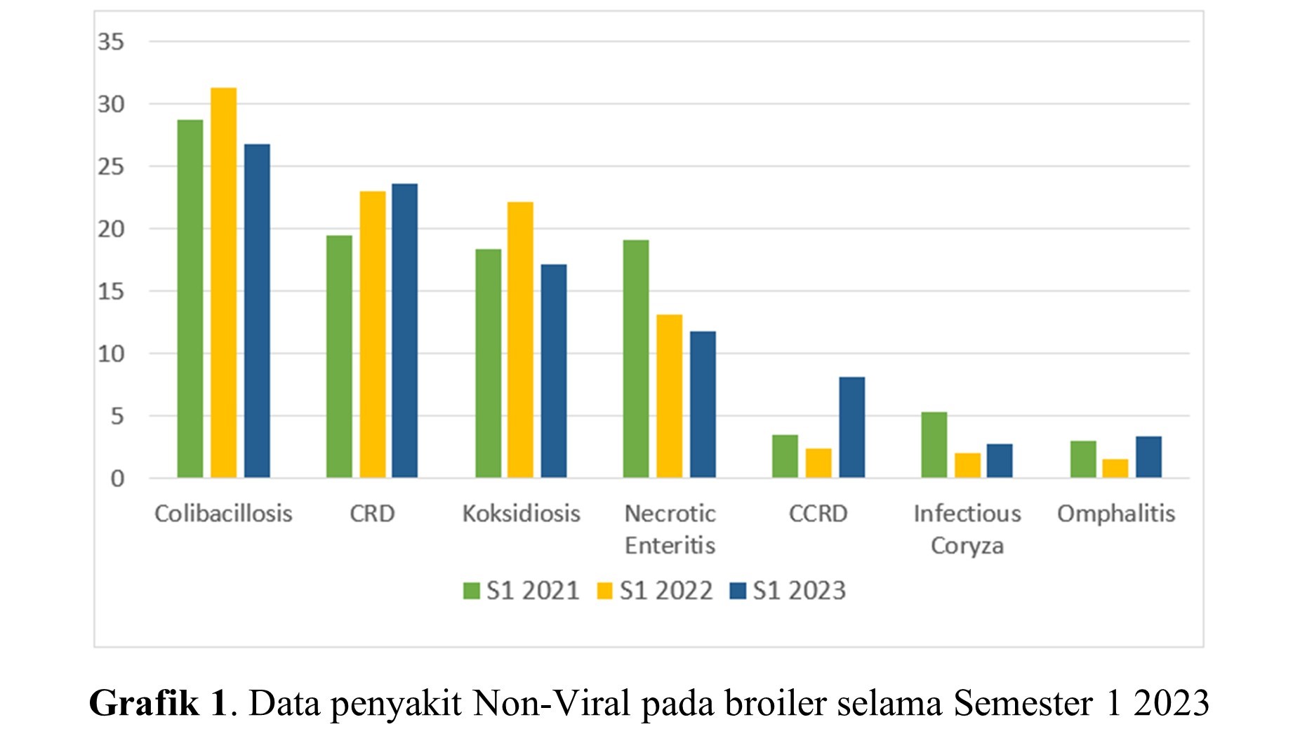 Perkembangan sektor peternakan unggas secara signifikan mengalami pertumbuhan khususnya ayam broiler dan ayam layer. Manajemen pemeliharaan yang baik dengan menjaga lingkungan peternakan diperlukan untuk dapat menghasilkan produk pangan asal hewan yang baik dan berkualitas. Kondisi lingkungan yang tidak kondusif dapat memberikan dampak penurunan performa produksi unggas hingga menyebabkan wabah beberapa penyakit. Peternak unggas modern kini menghadapi berbagai tantangan penyakit yang kian beragam. Salah satu penyakit parasit yang sering menyerang ayam dan menimbulkan kerugian adalah koksidiosis. Berdasarkan data penyakit yang dikumpulkan oleh tim technical support Tekad Mandiri Citra selama S1 2023 (Grafik 1), koksidiosis termasuk kedalam penyakit yang masih sering dialami oleh peternak. Dalam pemeliharaan ayam, kejadian koksidiosis hampir selalu muncul pada setiap periode pemeliharaan.
