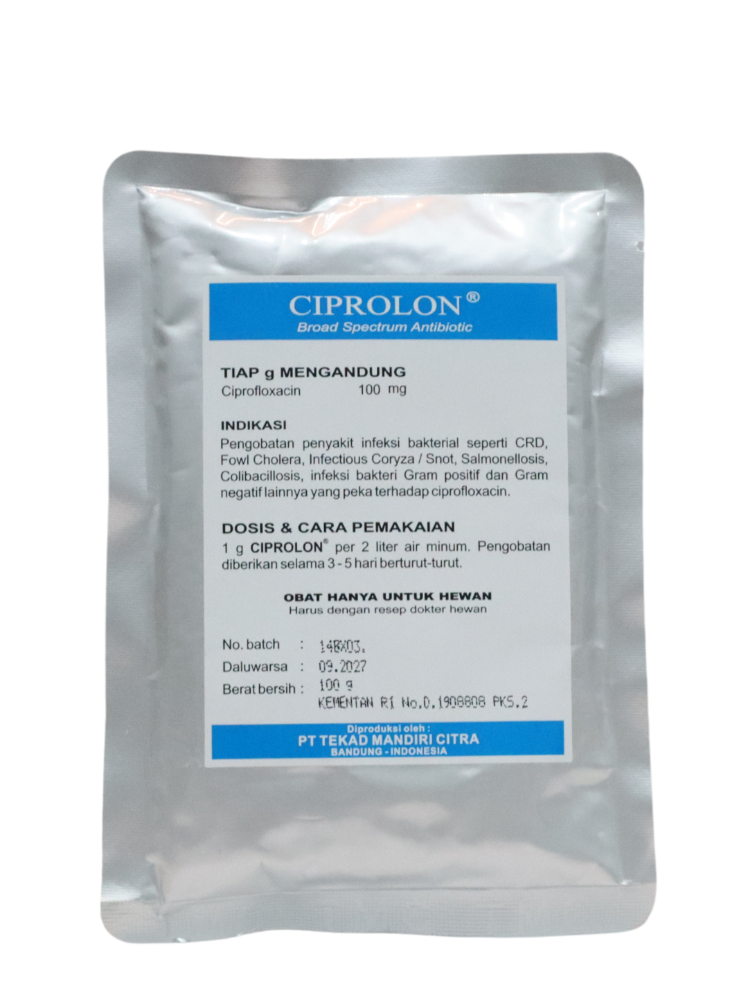 | CIPROLON adalah antibiotik dalam kelompok "Fluoroquinolone" yang sangat ampuh untuk membunuh mikroorganisme penyebab penyakit pada ayam seperti: Mycoplasmaspp., E. coli, Haemophilusspp., Salmonella spp., Pasteurellaspp., Streptococcusspp., Staphylococcusspp. dan mikroorganisme lainnya yang peka terhadap Ciprofloxacin. |