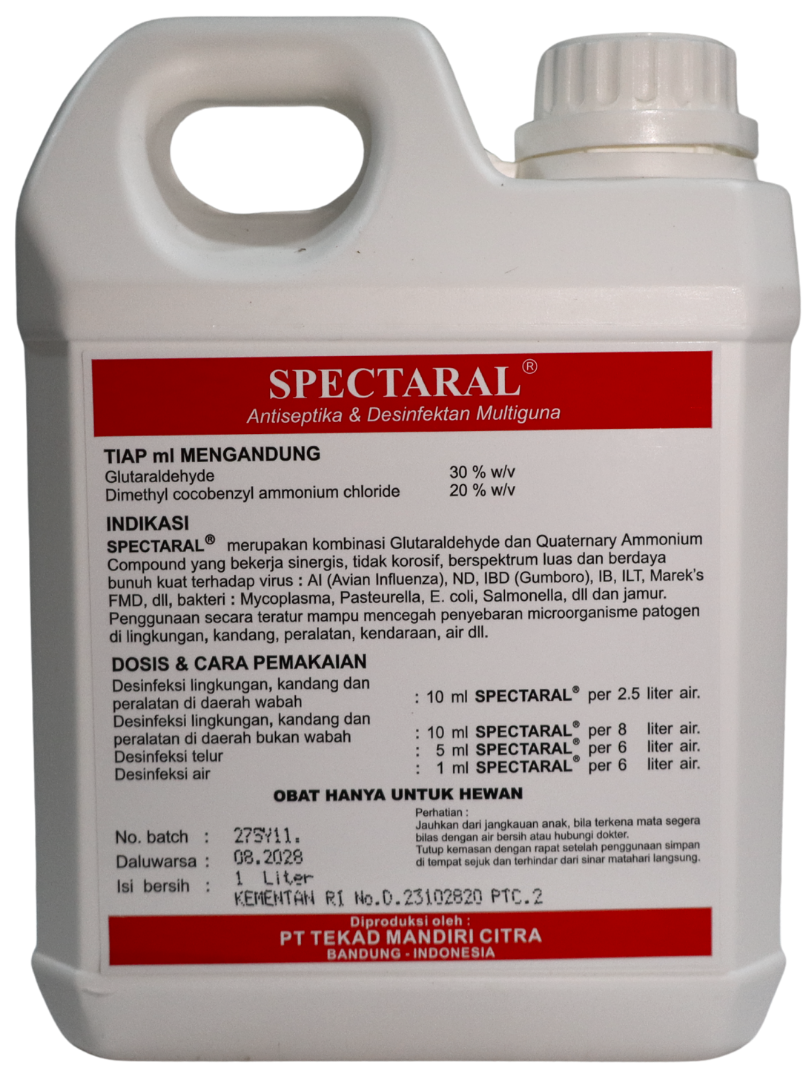 | SPECTARAL® merupakan kombinasi Glutaraldehyde dan Quartenary Ammonium Compound yang bekerja sinergis, tidak korosif, berspektrum luas dan berdaya bunuh kuat terhadap virus : Avian Influenza, ND, IBD, IB,ILT, Marek's, FMD, bakteri: Mycoplasma, Pasteurella, E. coli, Salmonella dan jamur.