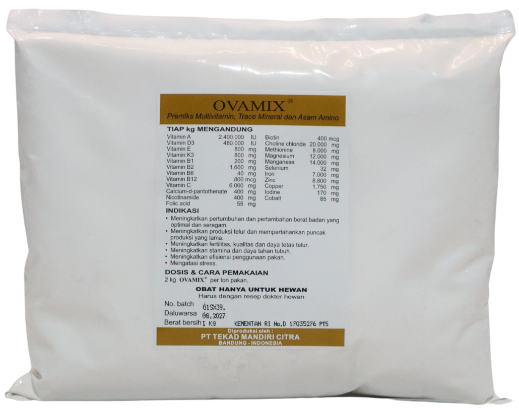 | OVAMIX® adalah premik multivitamin, trace mineral dan asam amino sebagai feed supplement untuk ternak yang diformulasikan secara khusus untuk mencukupi kebutuhan mineral dan vitamin yang seimbang. |